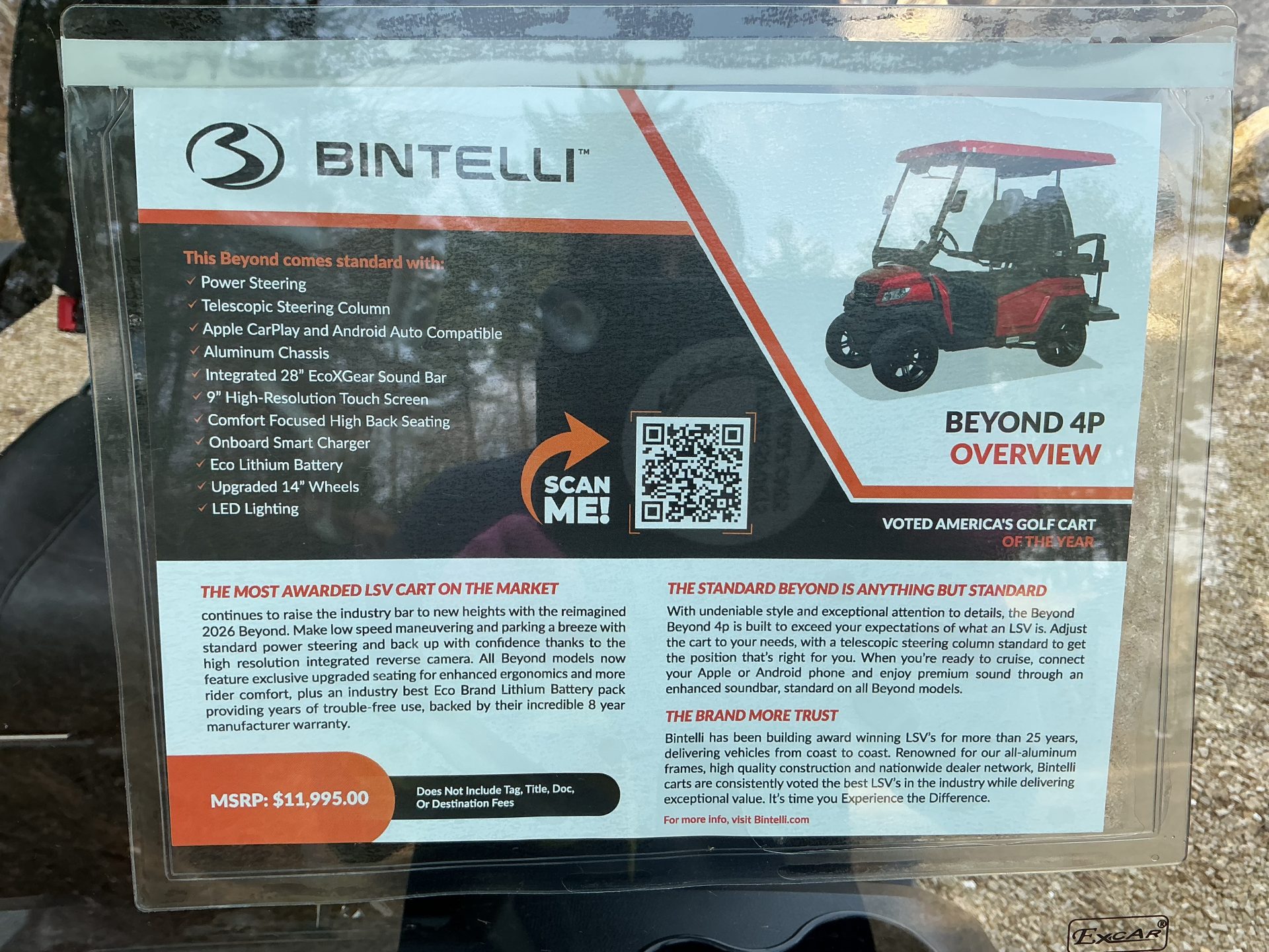 FEATURES: Lithium Ion Battery, Wireless Phone Charger, 9" High-Res Touchscreen, Bluetooth Sound System, Unique Keys, 4-Year Limited Warranty, DOT Windshield with Wipers, DOT Three-Point Seat Belts, Reverse Camera, Hydraulic Disc Brakes, Turn signals, LED Headlights, LED Taillights, Extended Roof, Running Distance Up to 30-40 Miles, Max Forward Speed Up to 25 mph, 4 WheelHydraulic Disc Brakes, 9" Turning Radius, 14" Wheels, Aluminum Frame and Chasiss. Max Load Capacity: 800 lbs. Dimensions: 9.4 ft L x 3.7 ft W x 6.6 ft H.