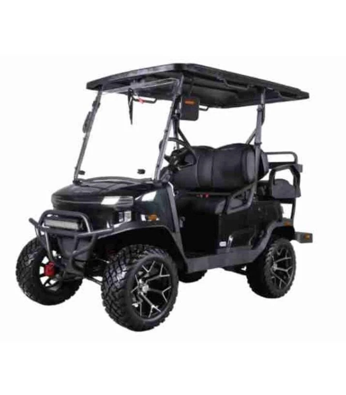 FEATURES: 5kW AC Motor, LiFePO4 Lithium Battery, Tilt Steering, Rear Camera, LED Headlights, Taillights, Brake Lights, Turn Signals, Hazards, Horn. High/Low Beam, Side Mirrors with Turn Signal Indicator, Four Wheel Hydraulic Brakes, Multiple USB ports, Rear Seat Grab Bar, Front and Rear Storage Space, Front and Rear Cupholders, Folding Front Windshield, 40 Mile Range, 5 Hours Full Charge, LED Front Light Bar, 14″ wheels with 23″ All Terrain Tires, Side Reflectors, Display – Digital Speedometer, Battery Level, Mileage, 110V AC outlet, High (25 MPH)/Low Speed (15MPH) Seatbelts, Brushguard, 2-YEAR LIMITED WARRANTY / 5-YEAR LITHIUM BATTERY WARRANTY* *Warranty coverage excludes labor and transportation fees.